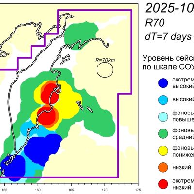 Уровень сейсмичности Камчатского участка зоны субдукции (по состоянию на 29 октября 2025 г.) – фоновый повышенный по шкале СОУС'09. (http://emsd.ru/files/ku/ViS2011-SOUS.pdf).