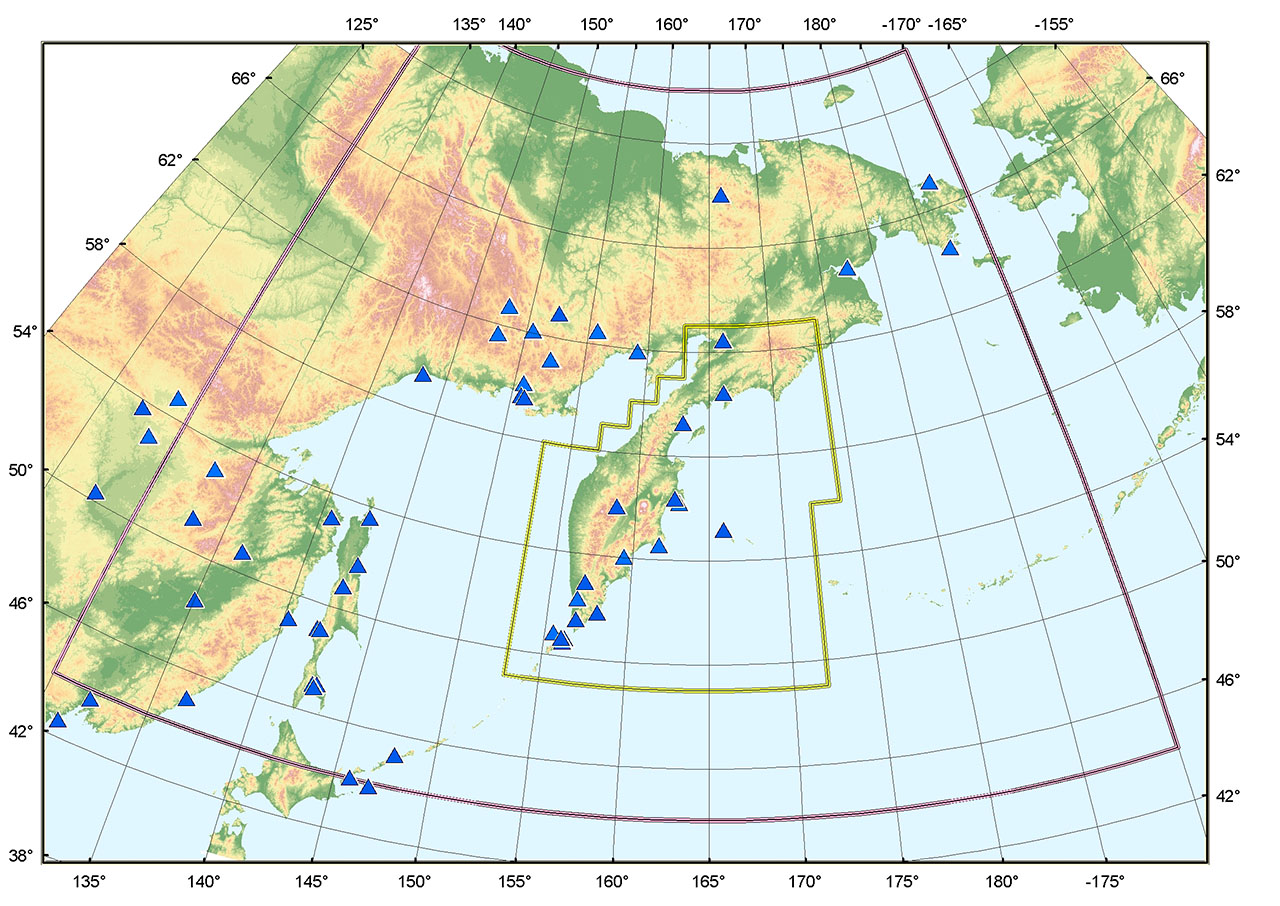 В режиме повседневной деятельности задержка обработки не более суток. Мониторинг сейсмической активности Камчатки, Командорских островов, частично Курильских, Алеутских островов и Корякского автономного округа. Максимальные границы зоны ответственности КФ ФИЦ ЕГС РАН: 48.0 – 62.5N; 150.5 – 174.0Е (см. карту, желтая линия). Максимальные границы района Дальнего Востока для землетрясений с М ≥ 6.0: 43.0 – 75.0N; 130.0 – 190.0Е (см. карту, красная линия). Полный регламент.